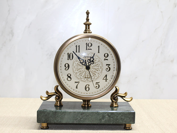 Mermer tabanlı masa üstü saat, klasik ve zarif tasarımıyla bulunduğu ortama şıklık katar. Yeşil mermer taban üzerine yerleştirilmiş metal gövdesi ve detaylı işlemeleriyle dekoratif bir görünüm sunar. 43x21 cm ölçüleriyle hem masa hem de raf üzerinde dikkat çekici bir aksesuar olarak kullanılabilir. Sağlam yapısı sayesinde uzun ömürlüdür ve klasik dekorasyonlarla uyum sağlayarak bulunduğu ortama nostaljik bir hava katar. Evinizde veya ofisinizde masa üstü dekorunu tamamlayacak şık bir parçadır.