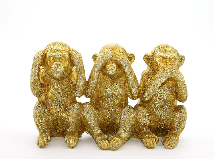 Polyester 3 Maymun figürü, "Görmedim, Duymadım, Bilmiyorum" temalı altın renkli dekoratif bir obje olarak tasarlanmıştır. 16x10 cm boyutundaki bu şık figür, anlamlı bir mesaj taşıyan, evde veya ofiste dekoratif amaçla kullanılabilecek zarif bir parçadır. Altın rengi detayları ve polyester malzemesiyle uzun ömürlüdür. Hem koleksiyonluk hem de anlamlı bir hediye olarak ideal bir seçenektir.